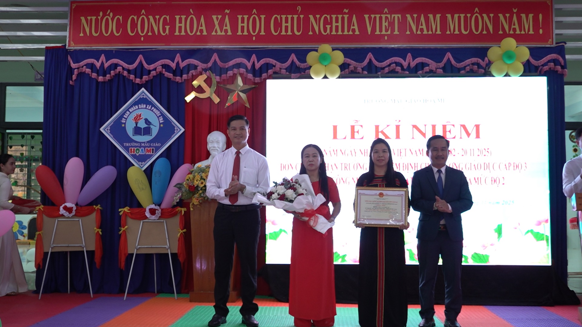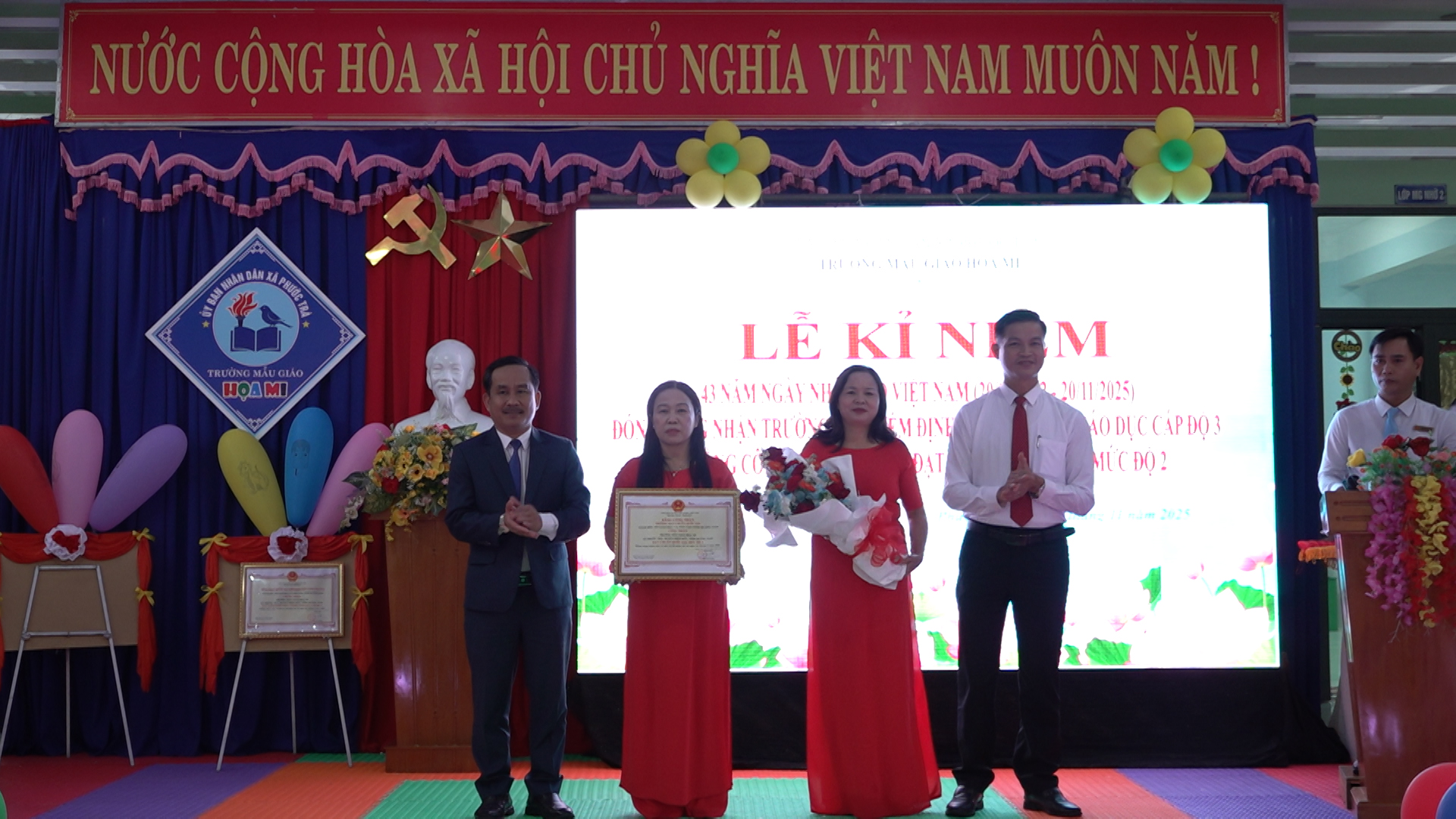 Tại buổi lễ, các đồng chí lãnh đạo xã đã trao Chứng nhận Kiểm định chất lượng giáo dục cấp độ 3 và Bằng công nhận Chuẩn Quốc gia mức độ 2 cho nhà trường. Đây là dấu mốc quan trọng, khẳng định uy tín và chất lượng giáo dục của Trường Mẫu giáo Họa Mi trong chặng đường mới.