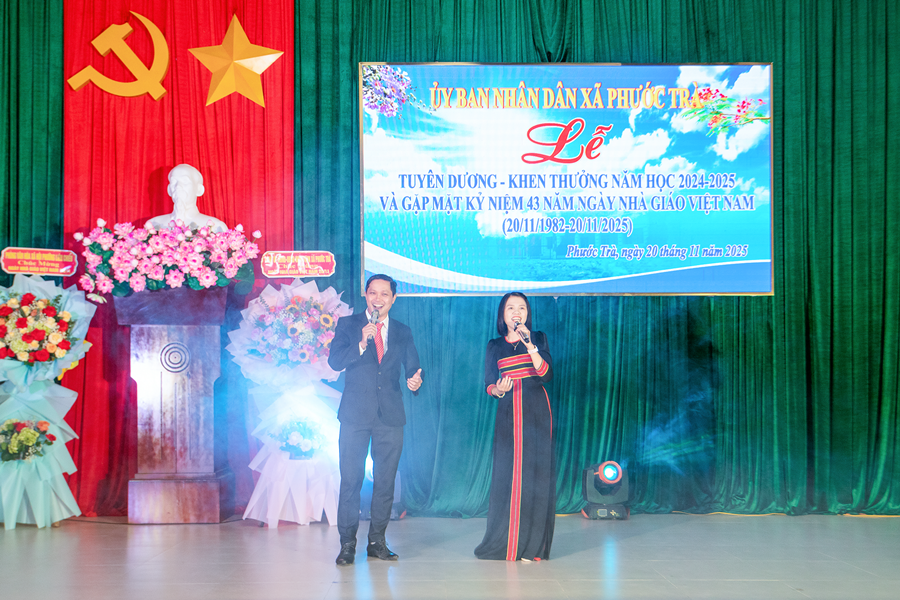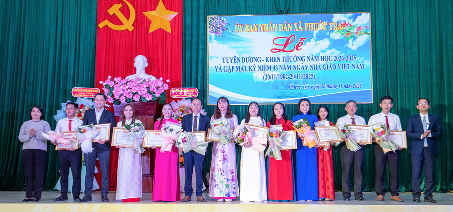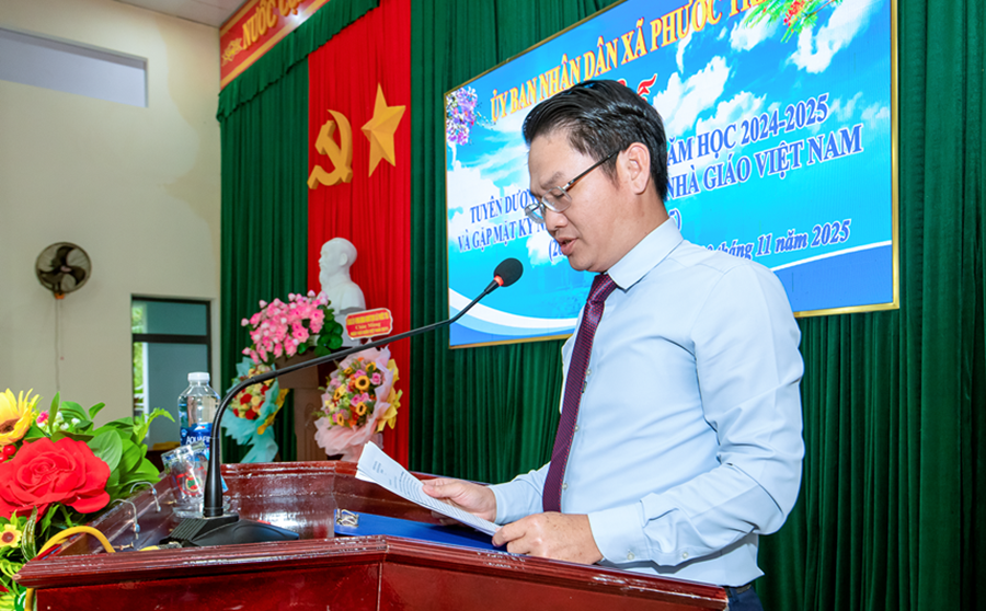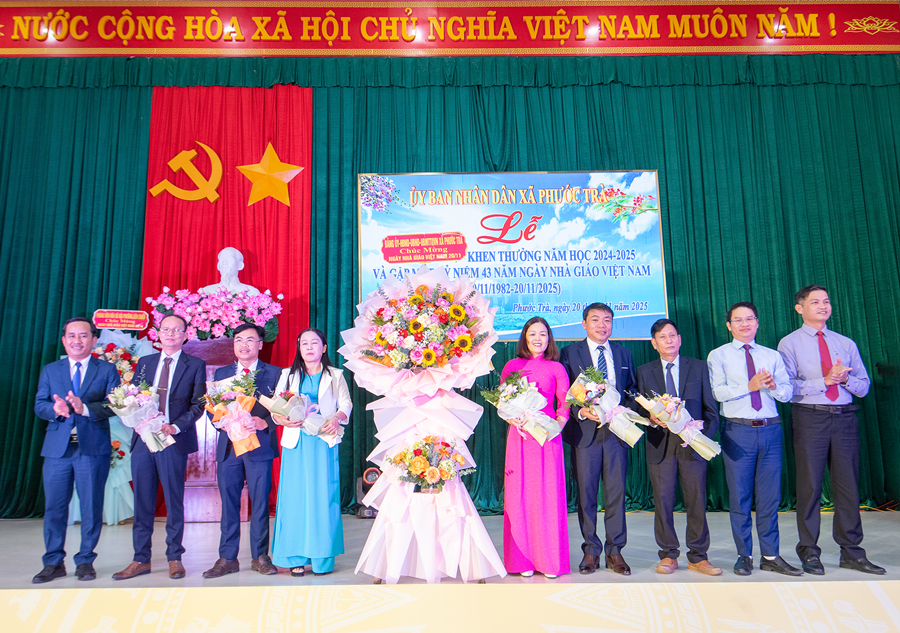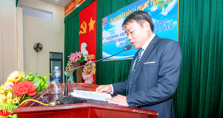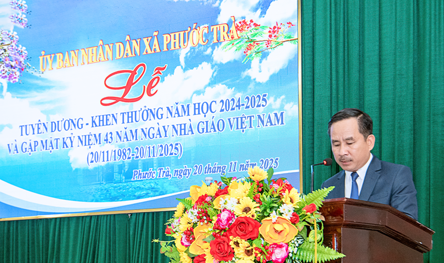 Tại buổi lễ, đồng chí Hoàng Văn Hùng - Chủ tịch UBND xã đã ôn lại truyền thống 43 năm Ngày Nhà giáo Việt Nam 20/11. Đồng thời, khẳng định vai trò đặc biệt quan trọng của giáo dục trong chiến lược phát triển con người và tương lai địa phương. Dẫn lại quan điểm của Đảng tại Nghị quyết 71 mới ban hành năm 2025, đồng chí nhấn mạnh: “Giáo dục là quốc sách hàng đầu - quyết định tương lai dân tộc”. Đây cũng là định hướng để Phước Trà tiếp tục ưu tiên nguồn lực, đầu tư đồng bộ cho giáo dục trong giai đoạn tới.