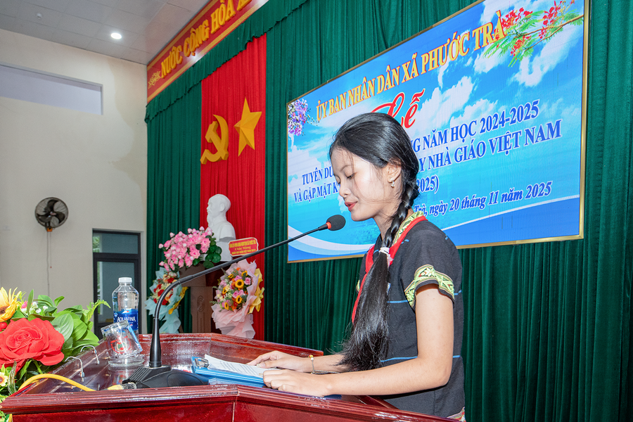 Em Đỗ Thị Ngọc Linh - học sinh lớp 9/2 Trường PTDTNT THCS Hiệp Đức đại diện học sinh toàn xã gửi lời tri ân và tặng hoa đến thầy cô. Những chia sẻ chân thành, trong trẻo của em đã khiến không khí buổi lễ thêm ấm áp và ý nghĩa.