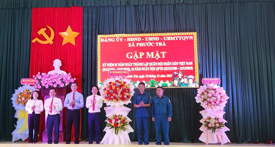 Nhân dịp này, vào chiều ngày 17/12, Đảng ủy - HĐND - UBND - Ủy ban MTTQ Việt Nam xã Phước Trà đến thăm và tặng lẵng hoa chúc mừng kỷ niệm 81 năm ngày thành lập Quân đội nhân dân Việt Nam 22/12/1944 - 22/12/2025 và 36 năm Ngày hội Quốc phòng toàn dân (22/12/1989 - 22/12/2025) tại Ban chỉ huy phòng thủ Khu vực 3 - Trà My.