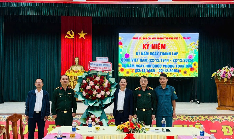 Lãnh đạo xã thăm và tặng hoa chúc mừng kỷ niệm 81 năm ngày thành lập Quân đội nhân dân Việt Nam 22/12/1944 - 22/12/2025 và 36 năm Ngày hội Quốc phòng toàn dân (22/12/1989 - 22/12/2025) tại Ban chỉ huy phòng thủ Khu vực 3 - Trà My